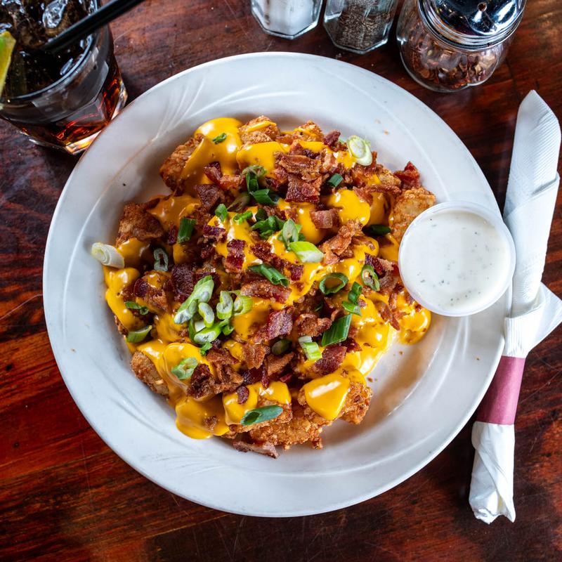Choice of tater tots or French fries topped with scallions, bacon, cheese, and choice of sauce or sour cream.
