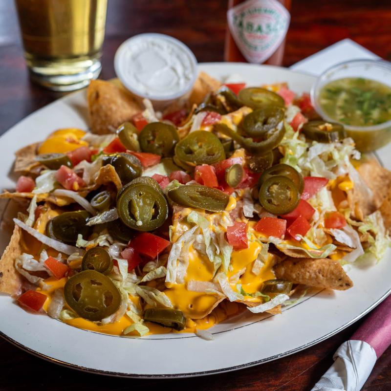 Chili $9.00 | Veggie $9.00 | Ground Beef $10.00 | Chicken $11.00 | Pulled Pork $12.00 | Steak $13.00 |Shrimp $15.00 • Homemade tortilla chips, refried beans, lettuce, tomato, jalapeños, cheese and sour cream | Add Guacamole +$3.00